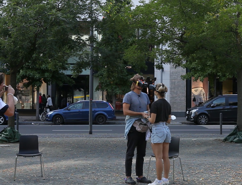 Two people or a couple meet in public space using VR glasses. They face and approach each other. Both protagonists wear a camera on their head that films the other person. What is being filmed is shown on the screen of the other person’s VR glasses. This creates a challenge to the normal visual perception. The protagonists’ visual perception has changed. From this moment on, intuitive movement is no longer given. A rethink is taking place. The usual logic is turned upside down. What do the protagonists have to do so that everyone receives a meaningful visual perception? In the best case he/she will find a new strategy. In this way, the public space has become a stage.