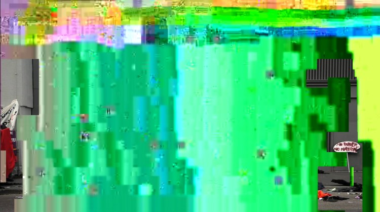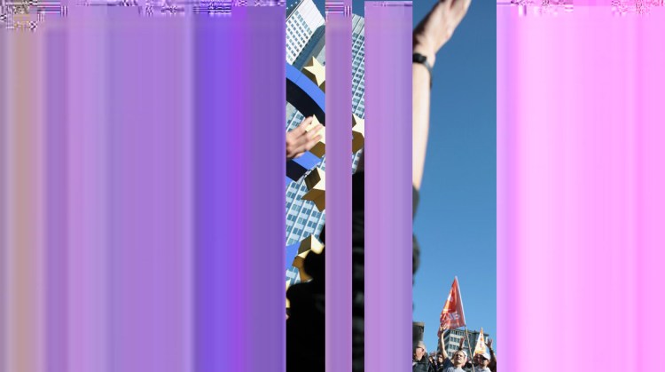Bold colourfulness announces the vibrating presence of the new series of pictures by Vanja Vukovic. Abstract areas and stripes cover the photos. Only few spots are discernible as reproductions of reality. Individuals with raised fists, helmeted policemen in green combat uniform, people with colourful wigs and banners can be distinguished here. Once we read the word “democracy”, elsewhere the name of a left-wing party. Signs with the inscriptions IWF and EZB in front of the star of Hörl’s monument to the Euro, by now in itself a symbol of the EU’s debt crisis and the excesses of capitalism, allude to the time and place of capture of the photographs. Vanja Vukovic conceals a large part of the visible area by deliberately placing disturbances that look like data errors during digital cinema and television broadcasts. The artist thus achieves to turn her photographic snapshot into a picture that hides a large part of reality, appearing like defective pixels in a film still that will disappear again a moment later, as we are used to from temporary image disturbances. When Vukovic states that she regards these computer-generated images as “faults of the system”, what does she thus aim to achieve with those picture disturbances? Is this a form of artistic censorship of the photos? Are they a means of capturing the vitality and the dynamics of the Occupy movement including the Blockupy demonstrations, the protests in Frankfurt in the early summer of 2013 where the reactions of the police forces were out of proportion? Does the artist even allude to the many channels like the state, press, social media, or analogue communication, each of which only conveys a detail of reality – and never “the whole truth”?